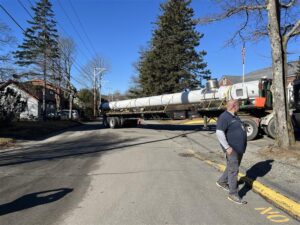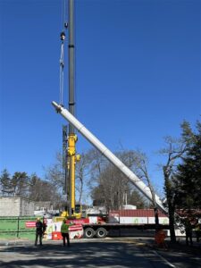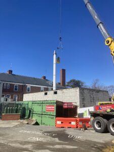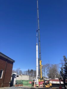 Pictured below is a 60 foot exhaust stack for our new core renovation plant. This will be for our two dual fueled boilers. It was engineered and designed to meet all of the most recent EPA and DEP standards for emissions. Cote Crane delivered, lifted, and placed the stack. Our contractors, Landry French and Johnson & Jordan secured it into place. Next, we will complete installing the roof, and get to work on the inside of the plant.