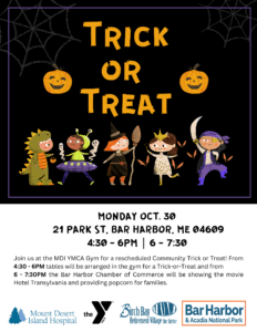 The Trail of Treats at Birch Bay Retirement Village originally scheduled for this evening, will be moved to Monday Oct. 30th from 4:30 – 6PM, now a partnered event with the MDI YMCA and Bar Harbor Chamber of Commerce. The event will be held inside the MDI YMCA Gym as there is a very high chance of rain that day. Following the Trick-or-Treat, the Bar Harbor Chamber of Commerce will be showing the movie Hotel Transylvania from 6 – 7:30PM providing popcorn to those in attendance.