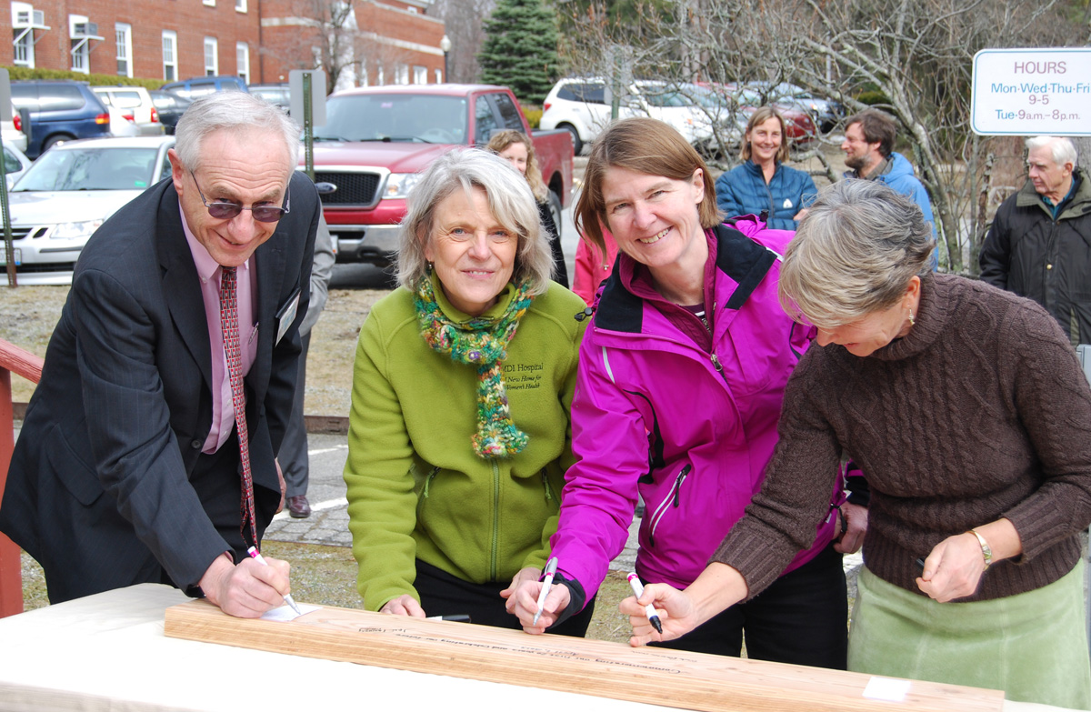 Hospital President/CEO Art Blank, left, joins Jane Tawney, PA-C, WHC physician’s assistant; Mary Dudzik, MD, WHC medical director; and Linda Robinson, CNM, WHC certified nurse midwife; placing the first signatures on the beam. The three women helped found the health center 20 years ago to better meet the health care needs of all women in the greater MDI region and were instrumental in the facility’s rebirth in a new building.