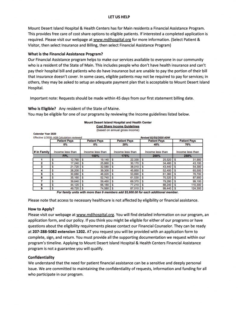 The billing statements for the Mount Desert Island Hospital Organization now have a new look, please see a sample of the new statement, front and back below. If you have questions about a bill, please contact our billing services department at pfs@mdihospital.org.