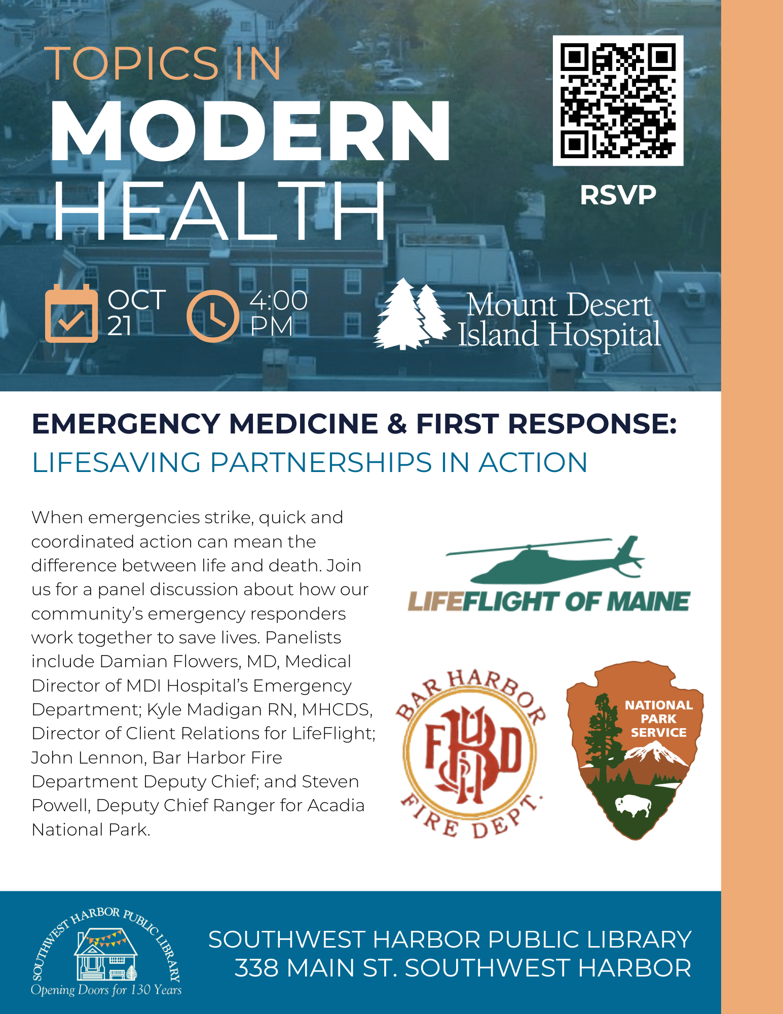When emergencies strike, quick and coordinated action can mean the difference between life and death. Join us for a panel discussion about how our community’s emergency responders work together to save lives. Panelists include Damian Flowers, MD, Medical Director of MDI Hospital’s Emergency Department; Kyle Madigan RN, MHCDS, Director of Client Relations for LifeFlight; John Lennon, Bar Harbor Fire Department Deputy Chief; and Steven Powell, Deputy Chief Ranger for Acadia National Park.